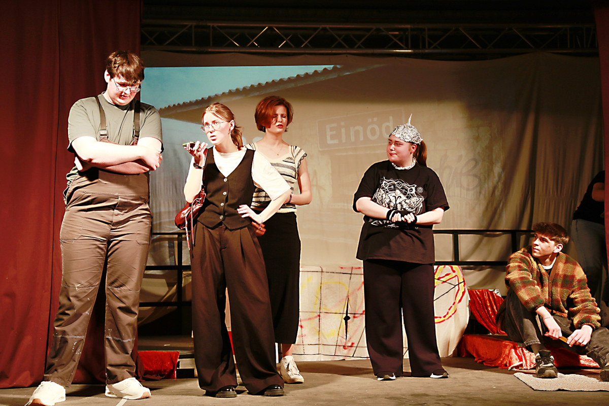 Unter Leitung von Lehrerin Karin Leser hatten die Schülerinnen und Schüler ein Schuljahr an dem Stück intensiv geprobt. Und das Ergebnis konnte sich sehen lassen! Zur Handlung: Die Komödie nimmt das Publikum mit an den trostlosen Bahnhof von Einöd – einen Ort, an dem man weder Handyempfang noch Hoffnung auf Weiterfahrt findet. Nachdem der ICE 6948 wegen eines außerplanmäßigen Halts seine Fahrgäste dort absetzt, beginnt ein turbulentes Durcheinander, das jedem bekannt vorkommt, der schon einmal mit Verspätungen, Gleiswechseln oder ausgefallenen Klimaanlagen zu kämpfen hatte.