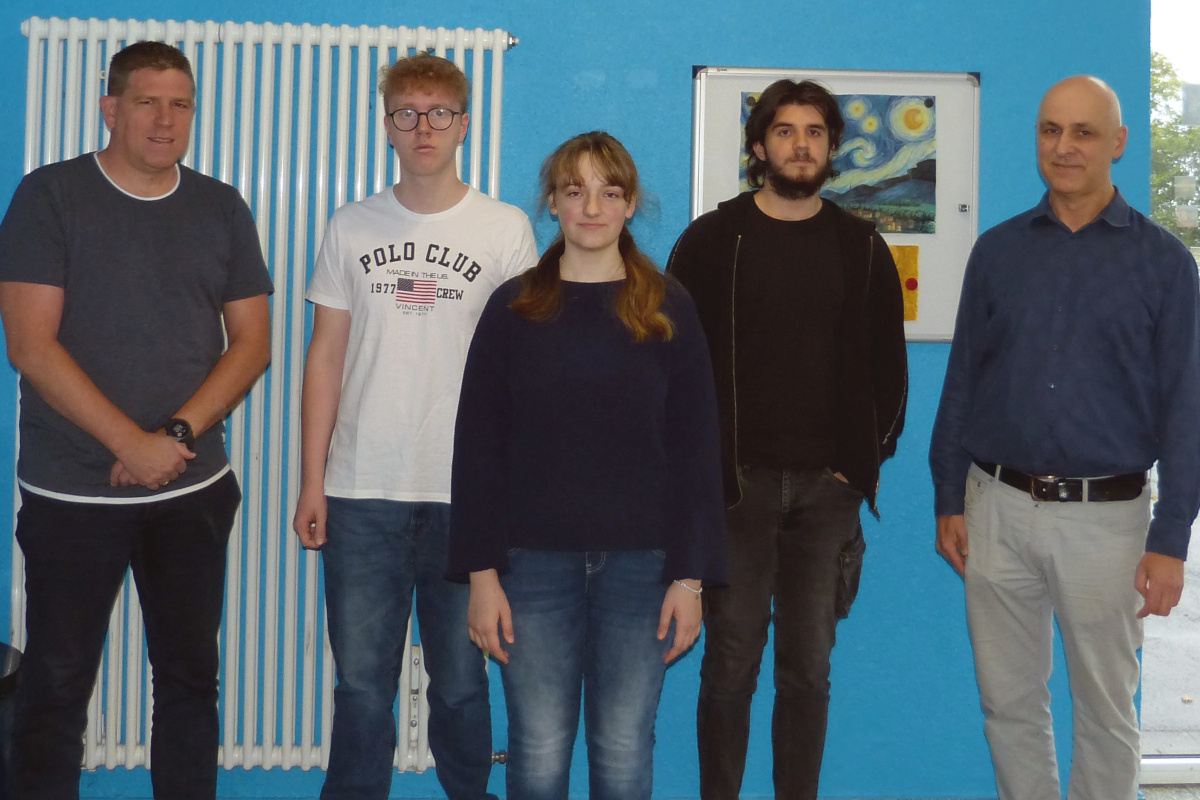 V. l. n. r.: Schulleiter Christian Tang, Tim-Jonas Meyer (10c), Johanna-Charleen Kassel (10c), Barna Bálint (EF), Koordinator Ottmar Wagner
