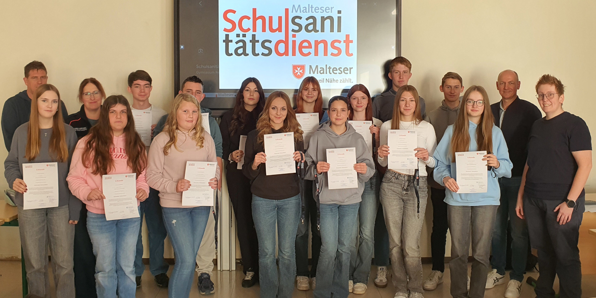 Lehrerin Anne Rath und Ausbilderin des Malteser Hilfsdienstes Stefanie Bätzel überreichten den Schülerinnen und Schülern gemeinsam ihre Urkunden. Sowohl Lehrer André Rohrbach, der gemeinsam mit Anne Rath für die Schulsanitäter zuständig ist, als auch Schulleiter Christian Tang dankten allen Schülern für ihr Engagement.